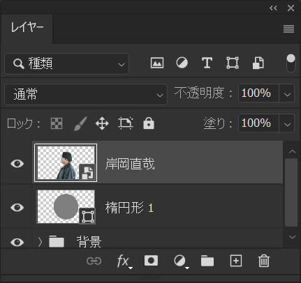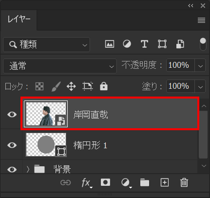 まずはレイヤーの上下関係を確認しよう、クリッピングマスクは下のレイヤーの形に上のレイヤーがマスクされるので、この画面では「岸岡直哉」が上「楕円形1」が下の位置関係になっていることを確認しよう!