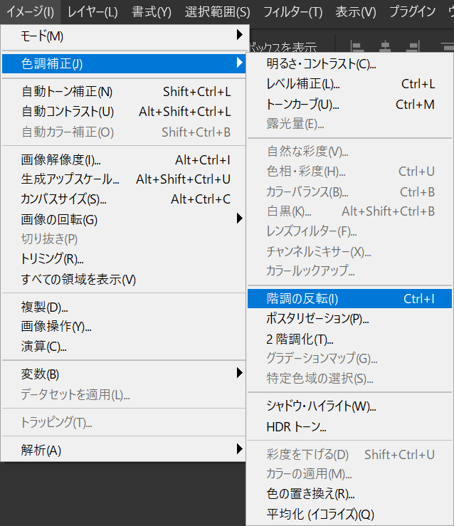 オプションバーの「イメージ」→「色調補正」→「階調の反転」を選択!